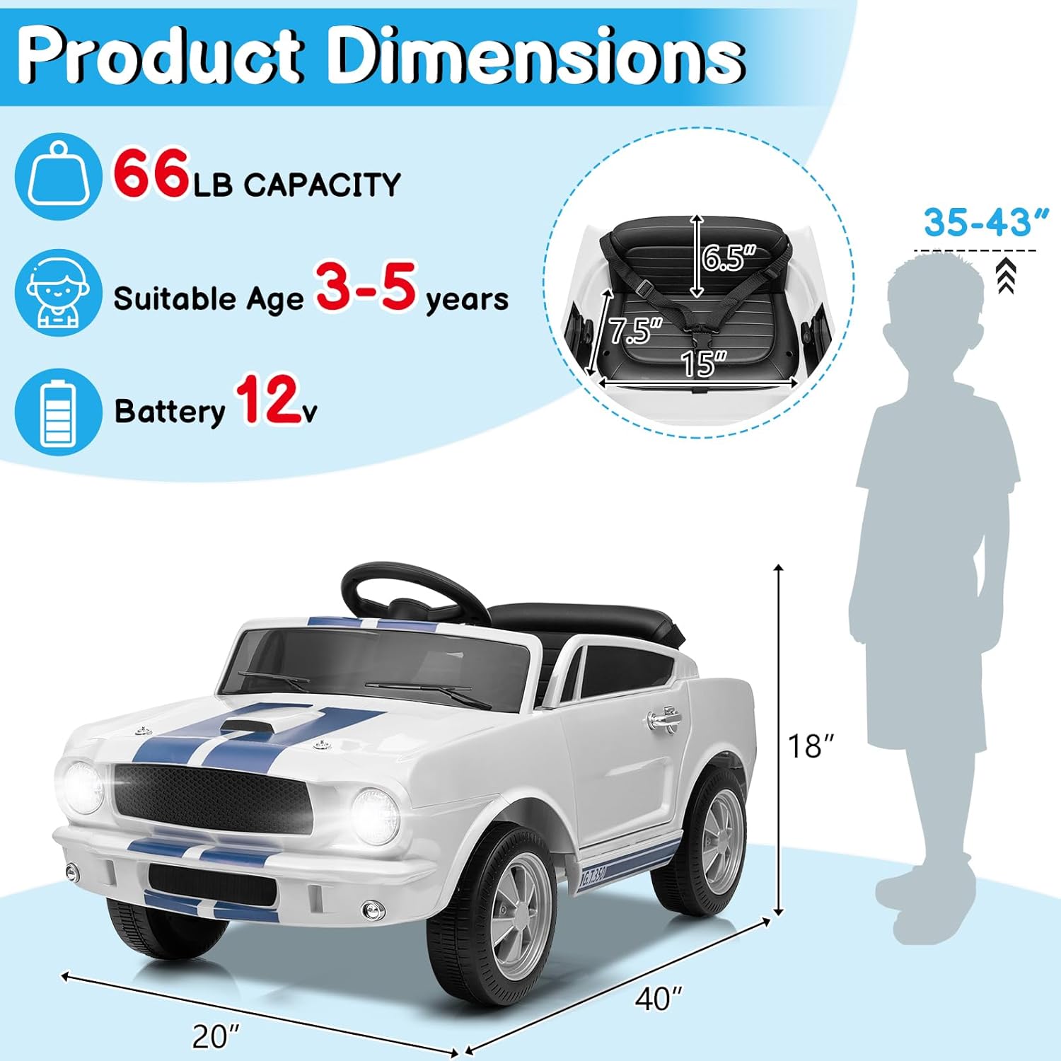 Winado Licensed Shelby Electric Car for Kids, Battery Powered Ride On Toy for Toddlers with Remote Control, Upgrade Display Panel, Bluetooth, Shock Absorbers, Safety Belt, 3 Speeds, LED Lights - White