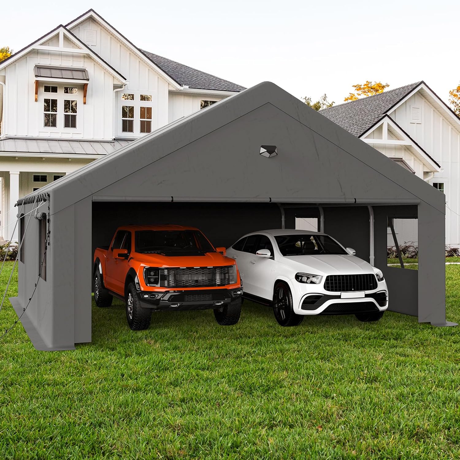 20x20 Carport, Heavy Duty Carport Canopy Garage with Removable Sidewalls and Drive Through Roll Up Zipper Doors, Grey