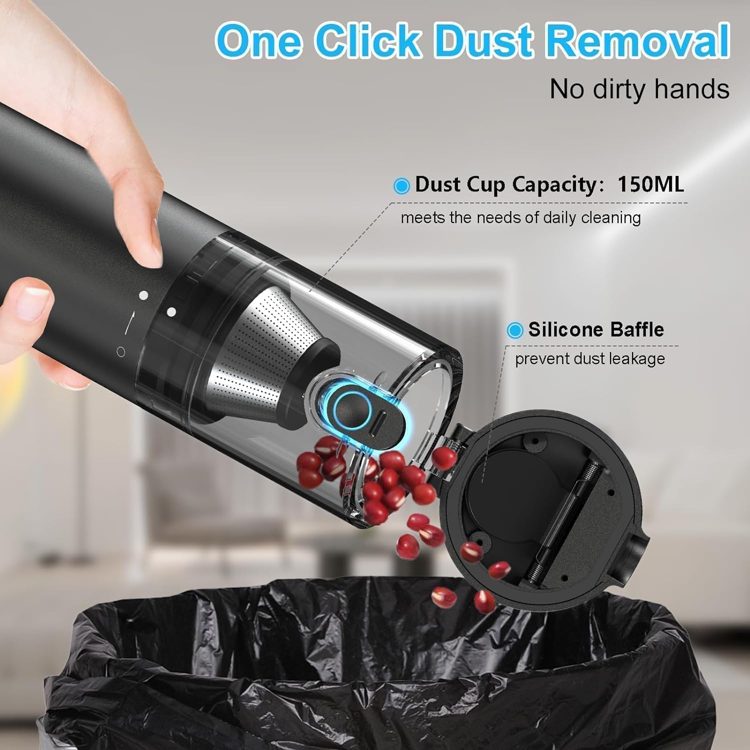 - ăTWO LARGE CAPACITIESăThis car vacuum portable cordless cleaner comes with a large 8,000mAh battery, which can be rapidly charged in just 4 hours. Additionally, the car vacuum is equipped with a sizable 150ml dust box, perfectly meeting your daily garbage collection needs.