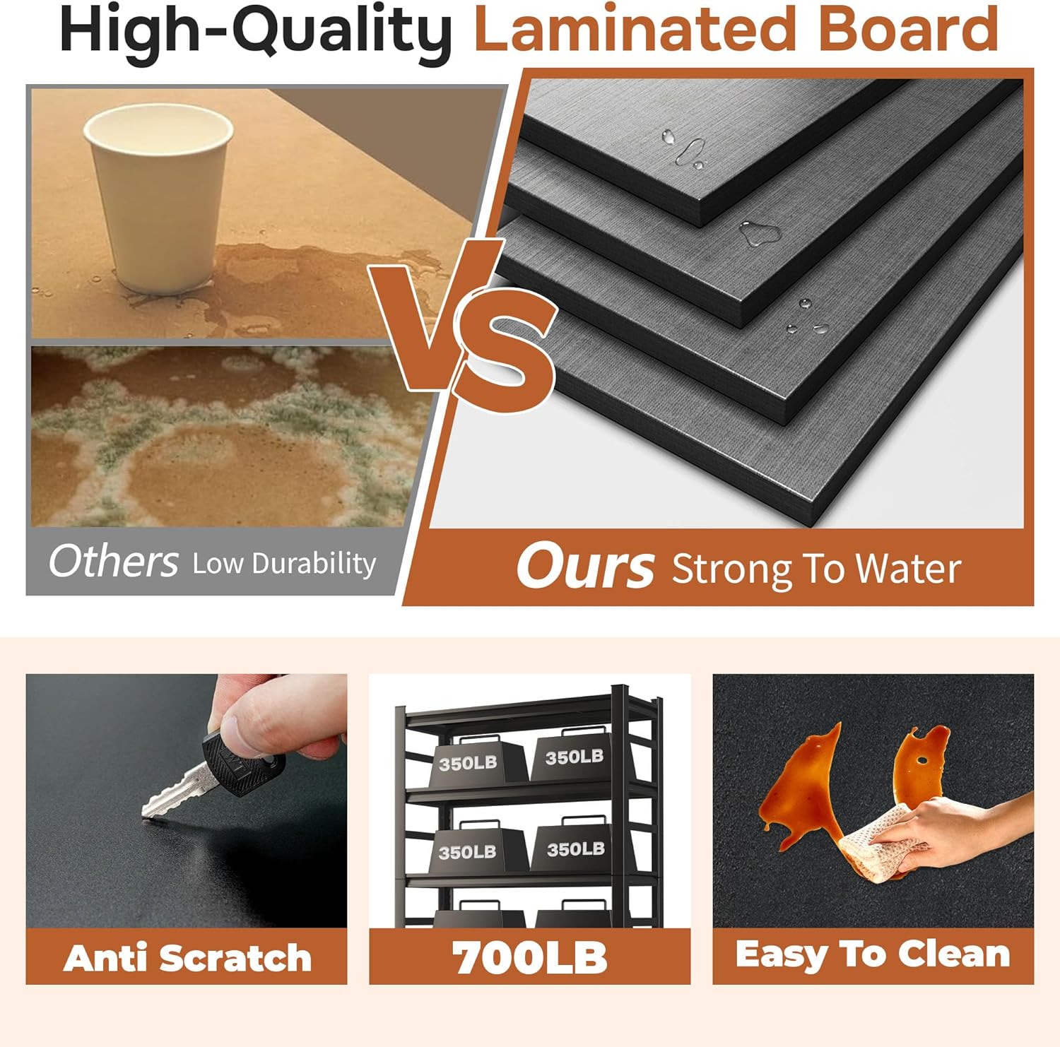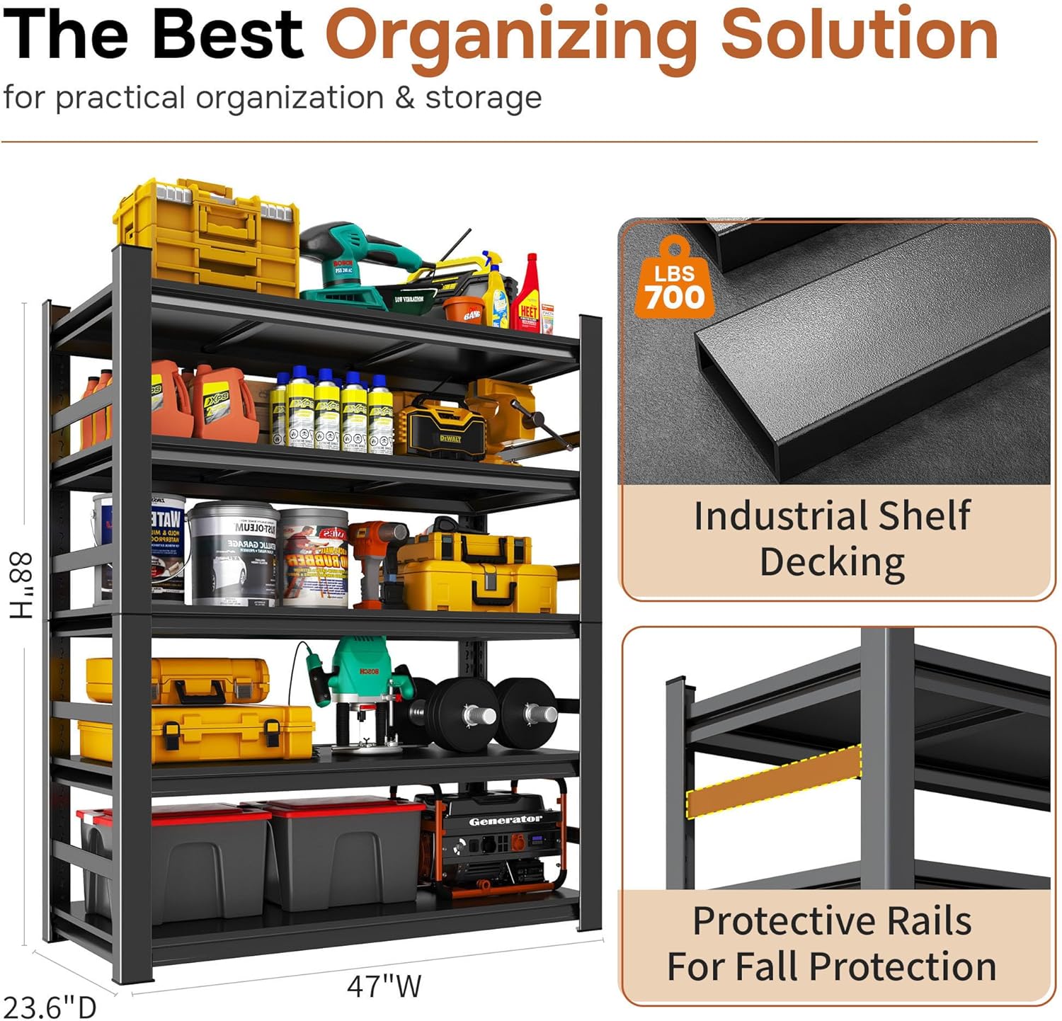 - đȘ COMMERCIAL-GRADE STRENGTH, 3500 LBS BEAST MODE â Don't settle for flimsy shelves. Our garage shelving is forged from high-quality, thickened cold-rolled steel and features an exclusive double-layered column design for unmatched stability. It effortlessly supports a massive 3500 LBS total capacity (700 LBS per shelf). From heavy power tools and packed totes to engine parts, store your heaviest items with absolute peace of mind. Conquer your clutter with confidence!