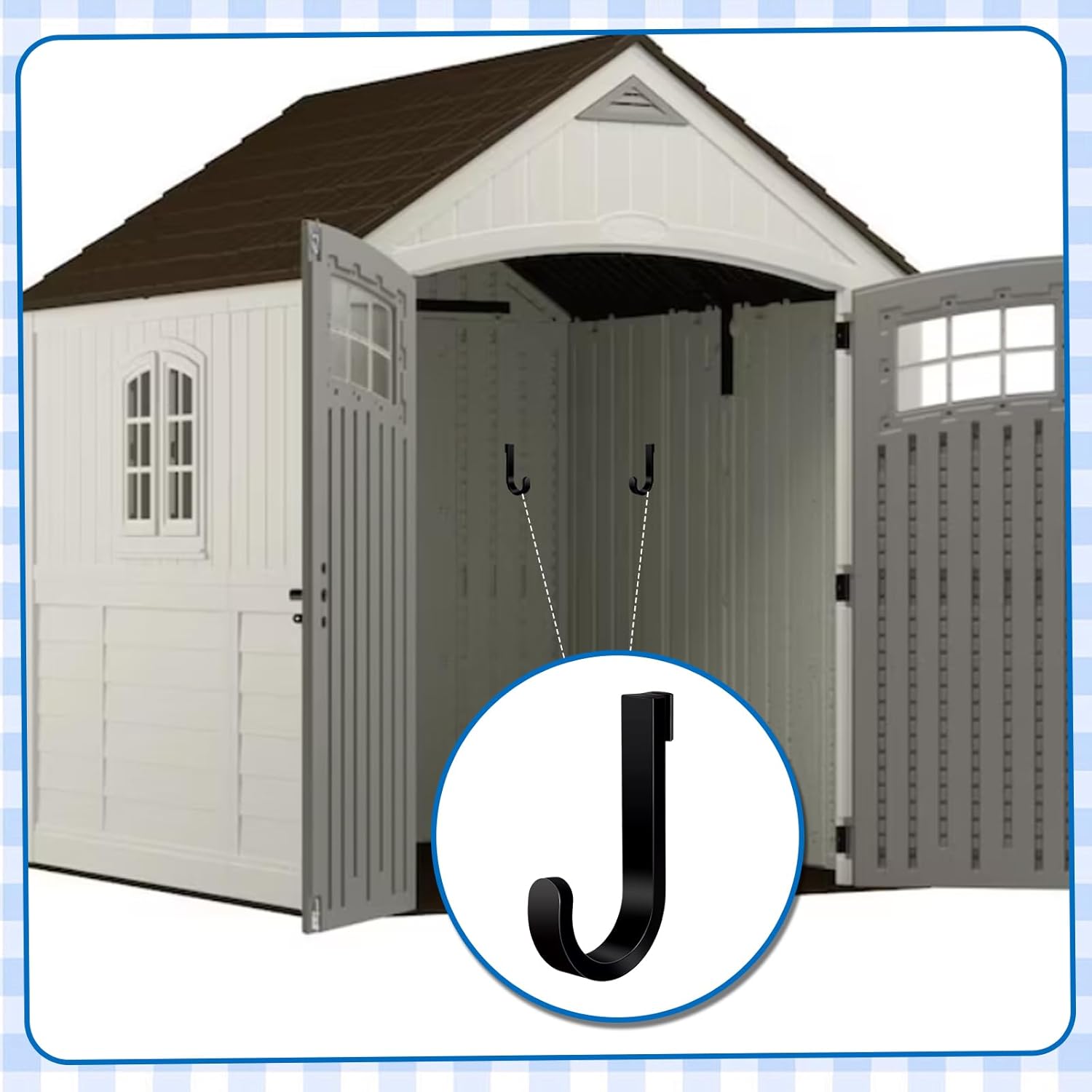 - Comprehensive Package: you will receive a total of 4 versatile storage hooks, perfectly compatible with lifetime sheds; Features 4 J-shaped hooks; Maximize your storage space effortlessly this comprehensive package offers everything you need to organize your shed efficiently and keep your tools within easy reach