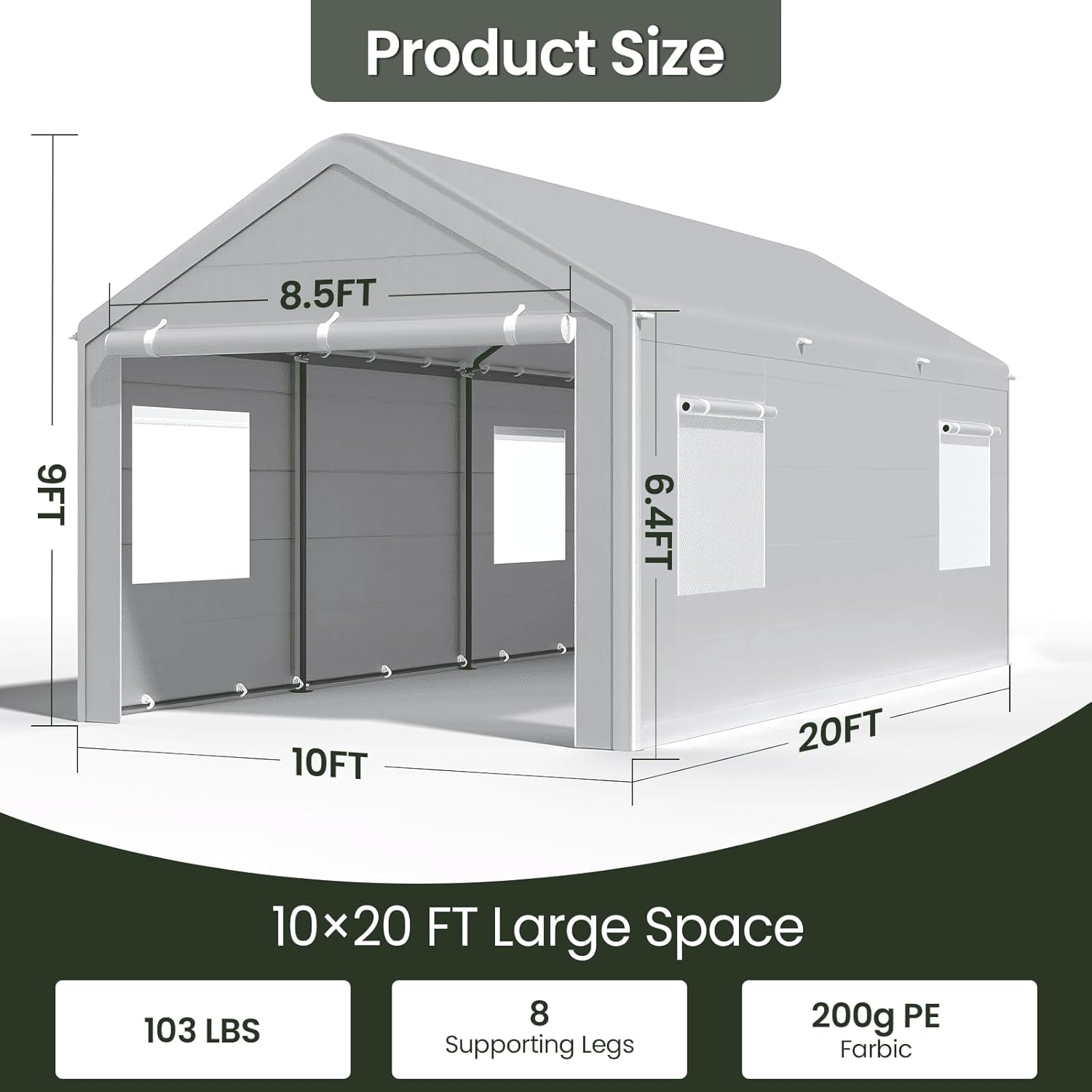 - LARGE CARPORT: The 10 ft Ă— 20 ft carport garage provides you with more spacious parking space for vehicles, trucks, and boats. The car shade can meet your parking, party, wedding, or commercial needs