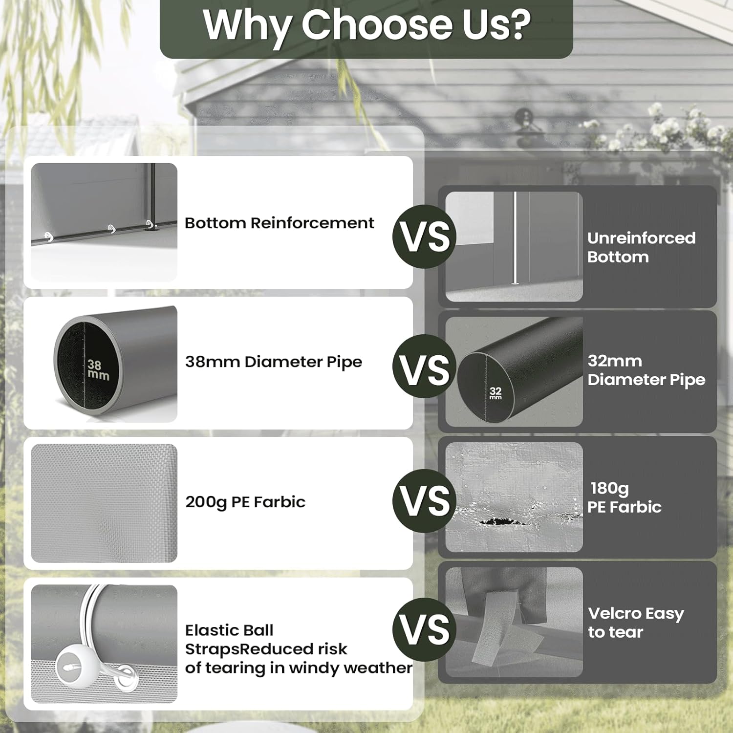 - ELASTIC CORD ATTACHMENT: 2 sidewalls each with 4 PVC transparent viewing windows with roll-up/down self-locking flaps. The elastic cord attached sidewalls make it more stable in windy conditions and reduce the risk of being torn down
