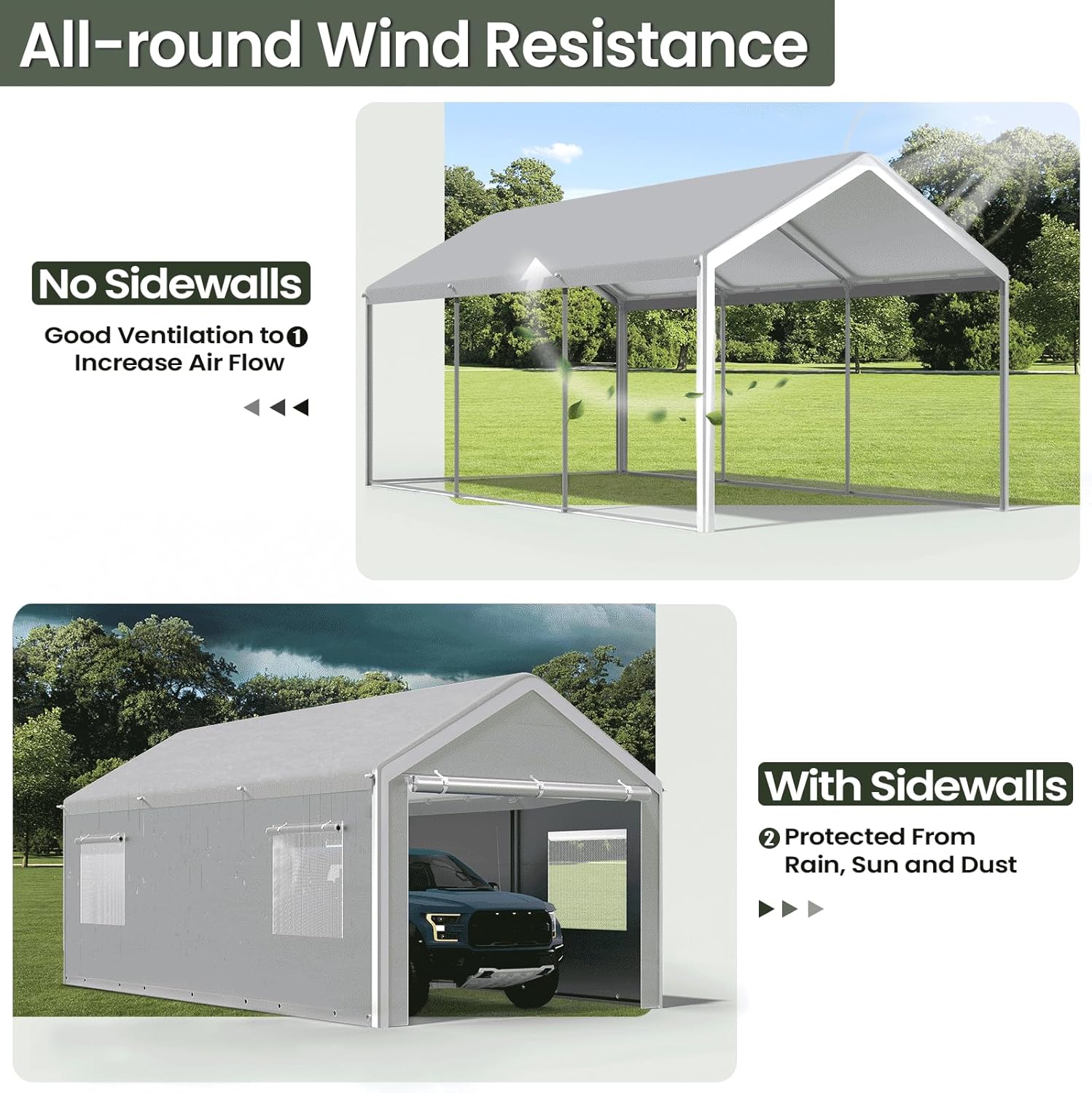 - REINFORCED GROUND BARS: New upgraded carport! Unlike the others, extra ground bars make the carports more stability and more wind-resistant on the ground