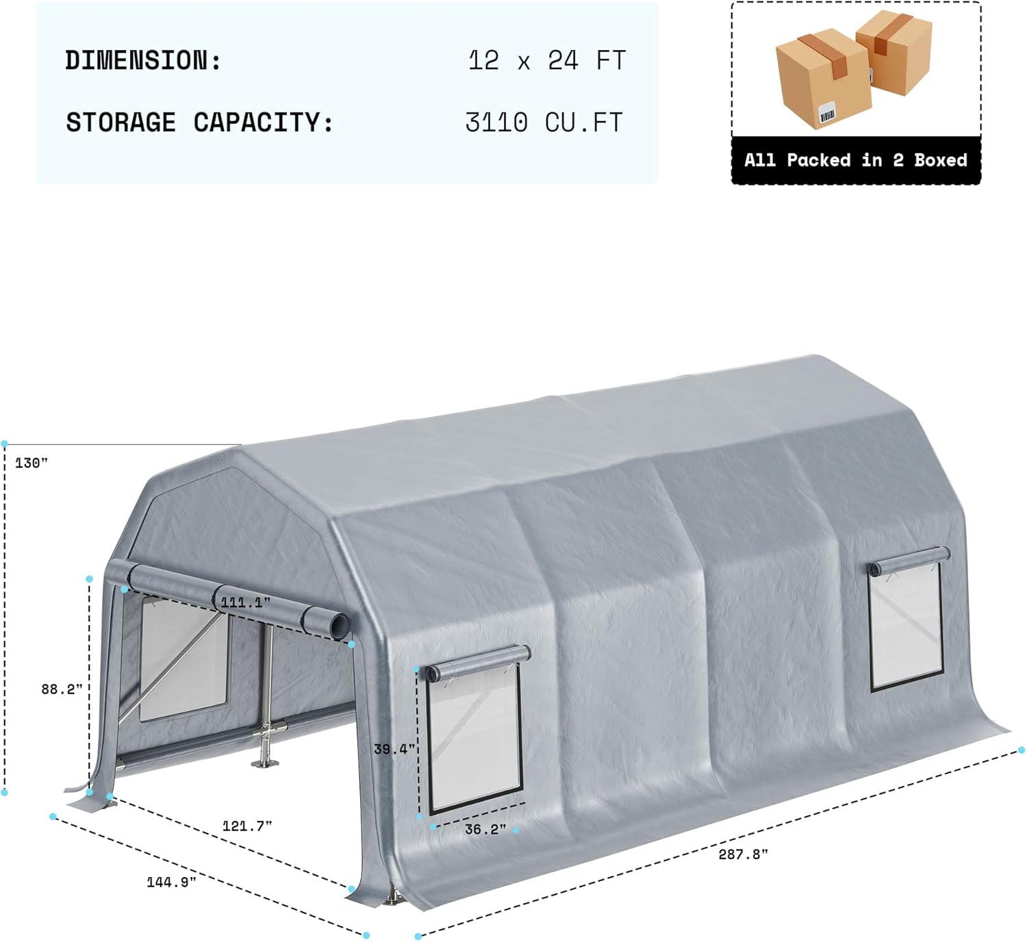 AMERLIFE 12x24 FT Heavy Duty Carport Garage Canopy, All-Weather Steel Frame Outdoor Shelter with Roll-Up Door & 4 Vented Windows, UV-Proof Waterproof Portable Storage for Cars, Boats, Silver