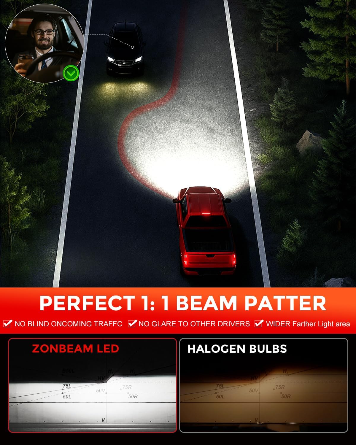 - [Super-Bright 40000LM] 2025 ZONBEAM H11 led bulbs with 40000lm ultra-high lumen output per group compared to halogen and 6000k cool white light, illuminates all the details on the roadway at night, making night driving more comfortable and safer.
