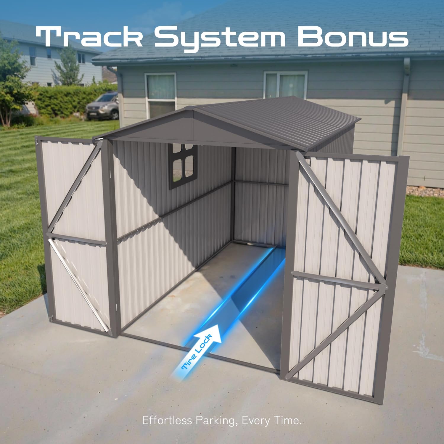 - [Multi-Use Flexibility] Customize your motorcycle storage shed with optional glide tracks for effortless parking, or go track-free for flexible layouts. Beyond bikes, this top-tier Heavy duty vehicle shed transforms into a premium storage hub for tools, gardening gear, pool equipment, and more. One shed, endless possibilities