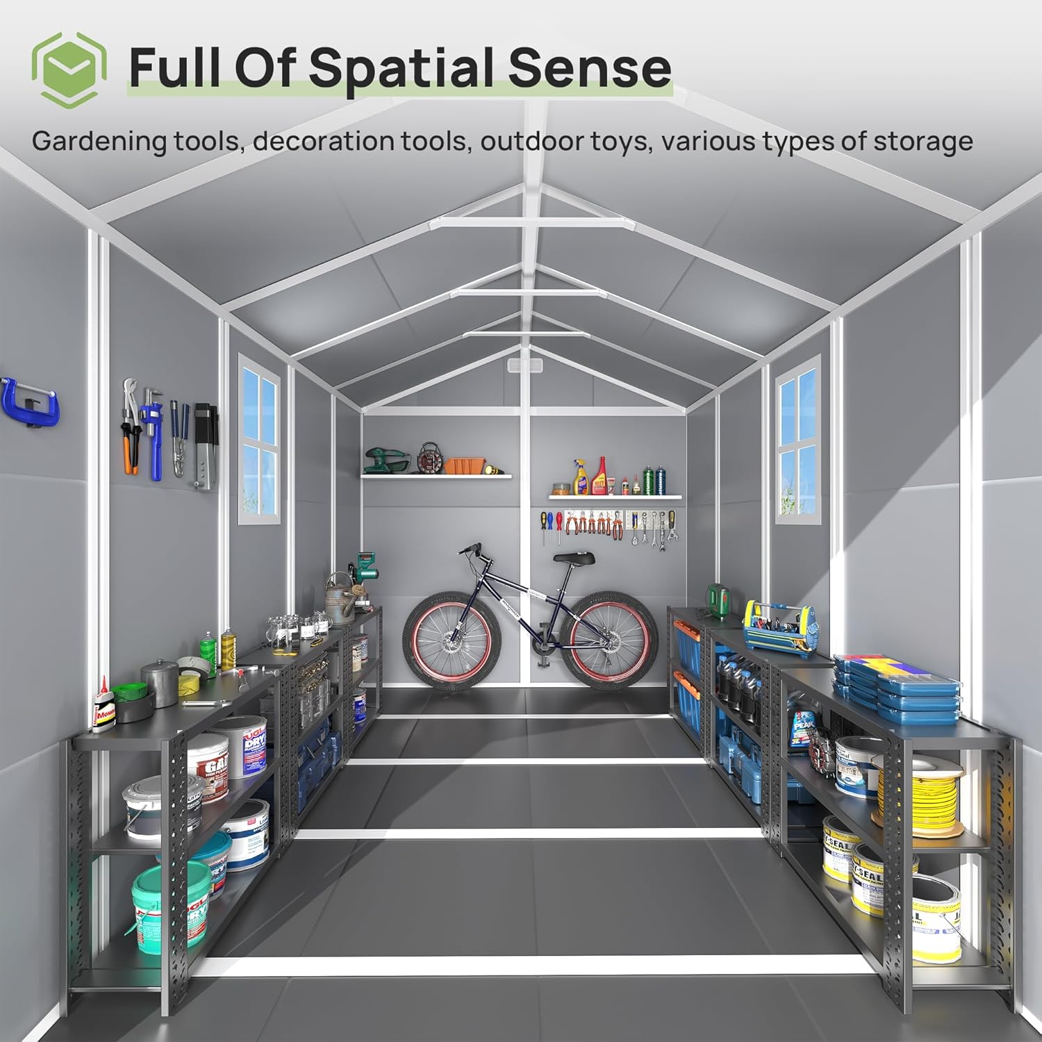 - Double-wall stable design: Tough, double-wall resin construction with impact-resistant floor for long-term durability. The overlapping wall panels are water and moisture resistant for worry-free use in all weather conditions,Weather-resistant, waterproof and UV protected will not peel, rot or rust.(Max Wind resistant grade: 6 (24-30 mph); Maximum snow thickness tolerance: 6 inches)