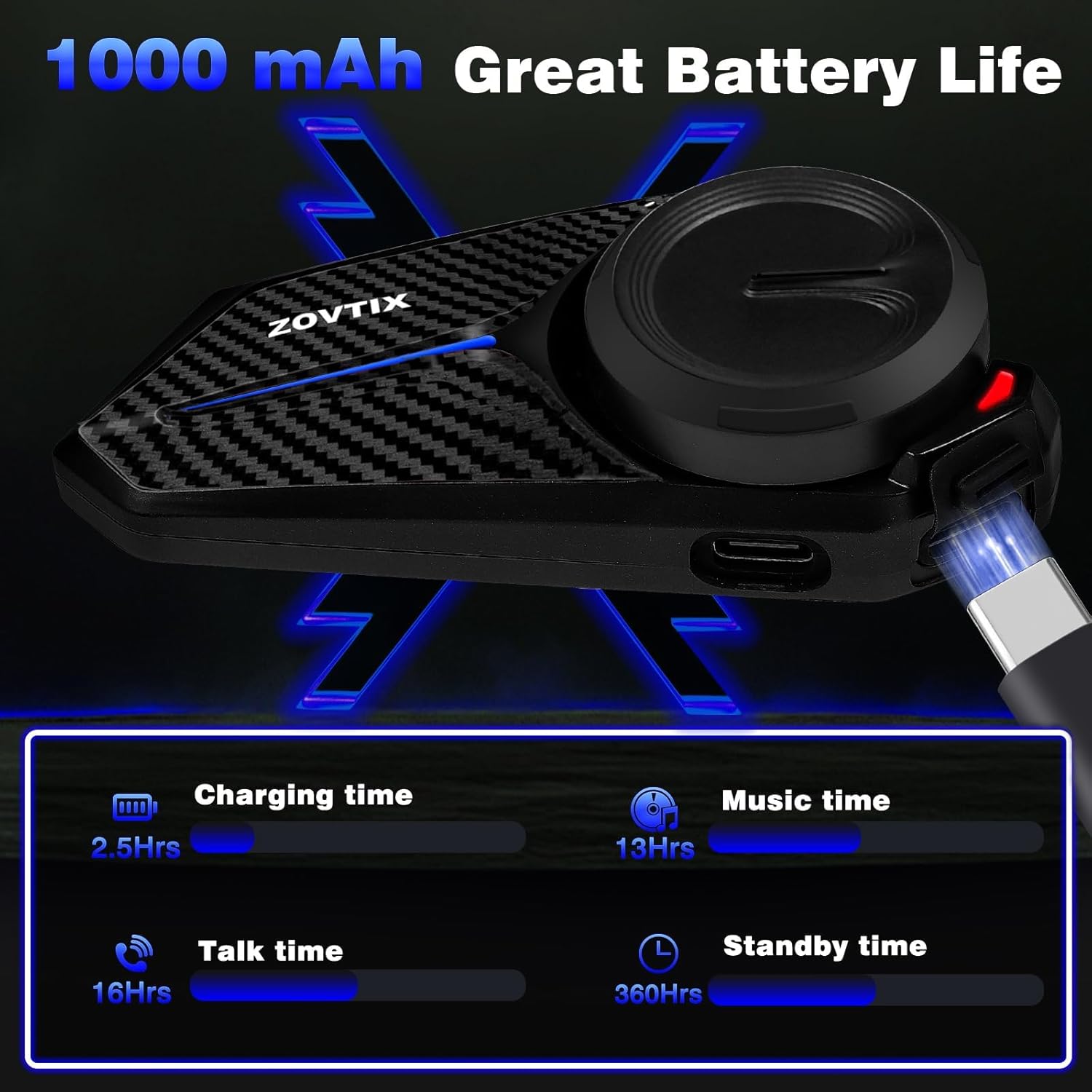 - 【1000mAh Ultra-Long Battery Life & IP67 Waterproofing】With a high-capacity 1000mAh battery, the ZOVTIX motorcycle helmet headset provides a standby time of over a week and up to 16 hours of continuous operation after just 2.5 hours of charging. Moreover, the X8 motorcycle headphones, designed with IP67 waterproof and dustproof ratings, functions seamlessly in any weather conditions, allowing you to focus on the joy of riding