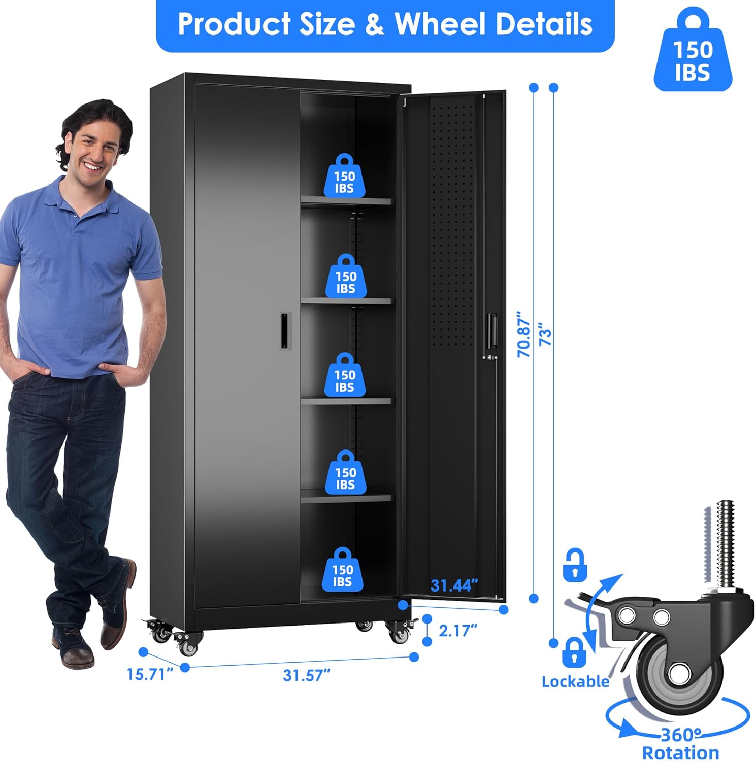 Metal Storage Cabinet with Wheels, Pegboard and 4 Hooks, 73" H Garage Storage Cabinet with 4 Adjustable Shelves and 2 Lockable Doors for Garage Home Office Warehouse, Black, Assembly Required