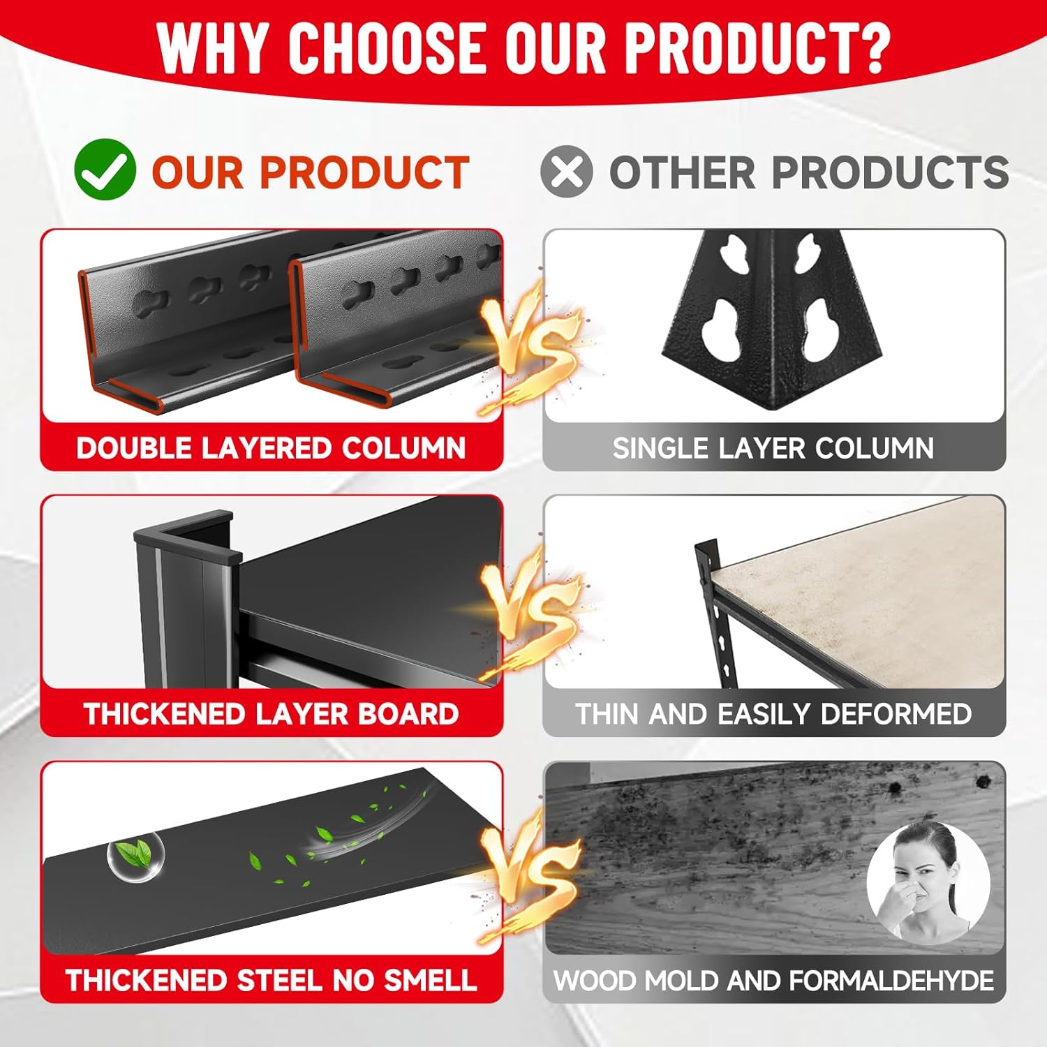 - ăGarage Shelving Heavy Duty Load 3500LBS ă This storage shelves features double-layer reinforced uprights with support ribs on each shelf level. Constructed from a high-quality steel frame and durable steel decking, each shelf supports up to 700 LBS, delivering a total capacity of 3500 LBS. This robust 5-tier shelving unit offers exceptional stability and strength, allowing you to store more items securely.