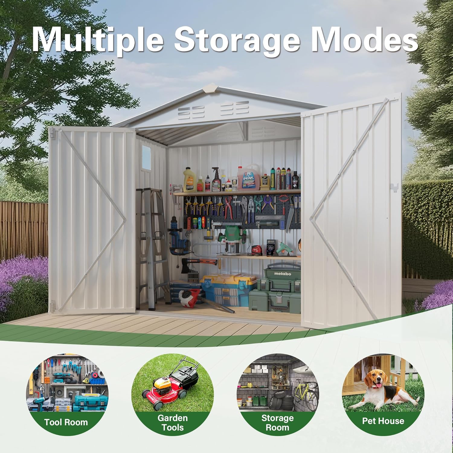 - đłăVersatile Outdoor Storageă Maximize your outdoor space with this versatile metal shed, ideal for patios, backyards, gardens, or lawns. Its spacious, well-designed interior accommodates lawnmowers, gardening tools, seasonal decorations, bicycles, or even serves as a secure hobby workshop. This casita de patio keeps your belongings organized and protected from the elements, providing a flexible solution to maintain a tidy and functional outdoor area