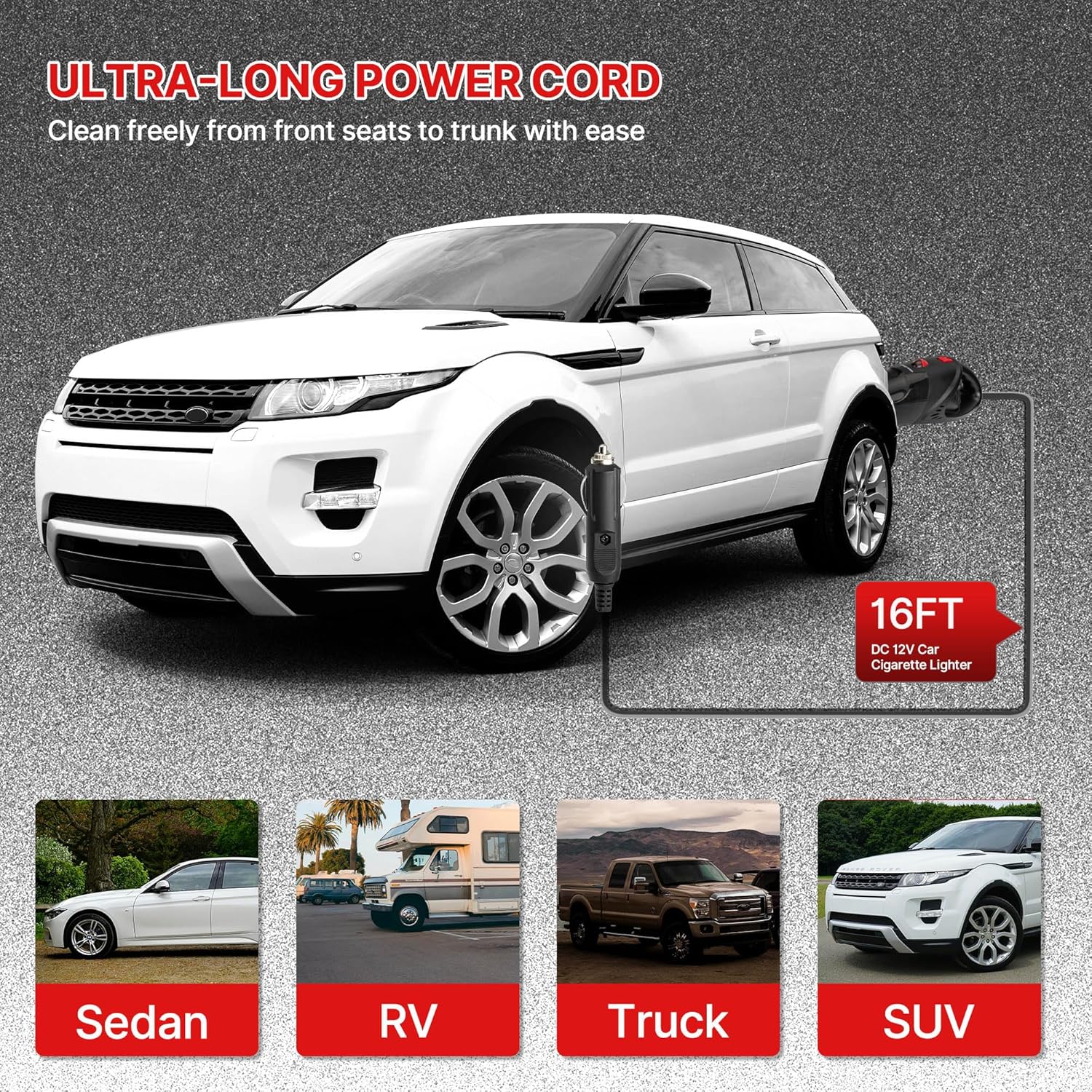 - Easy Plug & Go: Simply plug into your car’s 12V cigarette lighter socket and start cleaning instantly. The 16ft extra-long power cord reaches every corner of your vehicle, from trunk to dashboard, without unplugging.