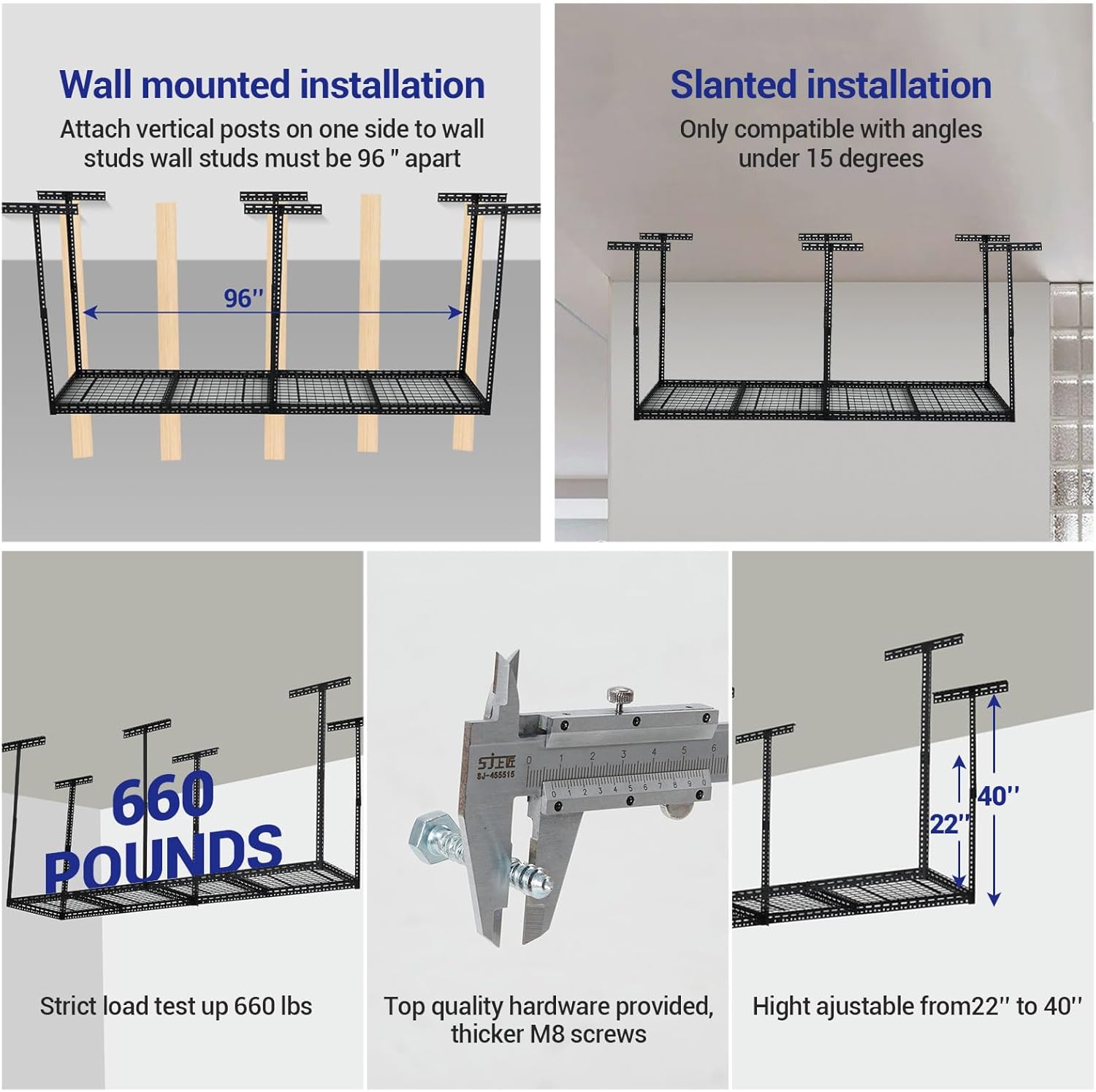 - Space-Saving 53 Cu.Ft Storage: Maximize unused ceiling space with 96"x24"x40" dimensions, adding 53 cubic feet of organized storage. The open grid design provides easy visibility/access to stored items while freeing up garage floor space for cars, workbenches, or bikes.