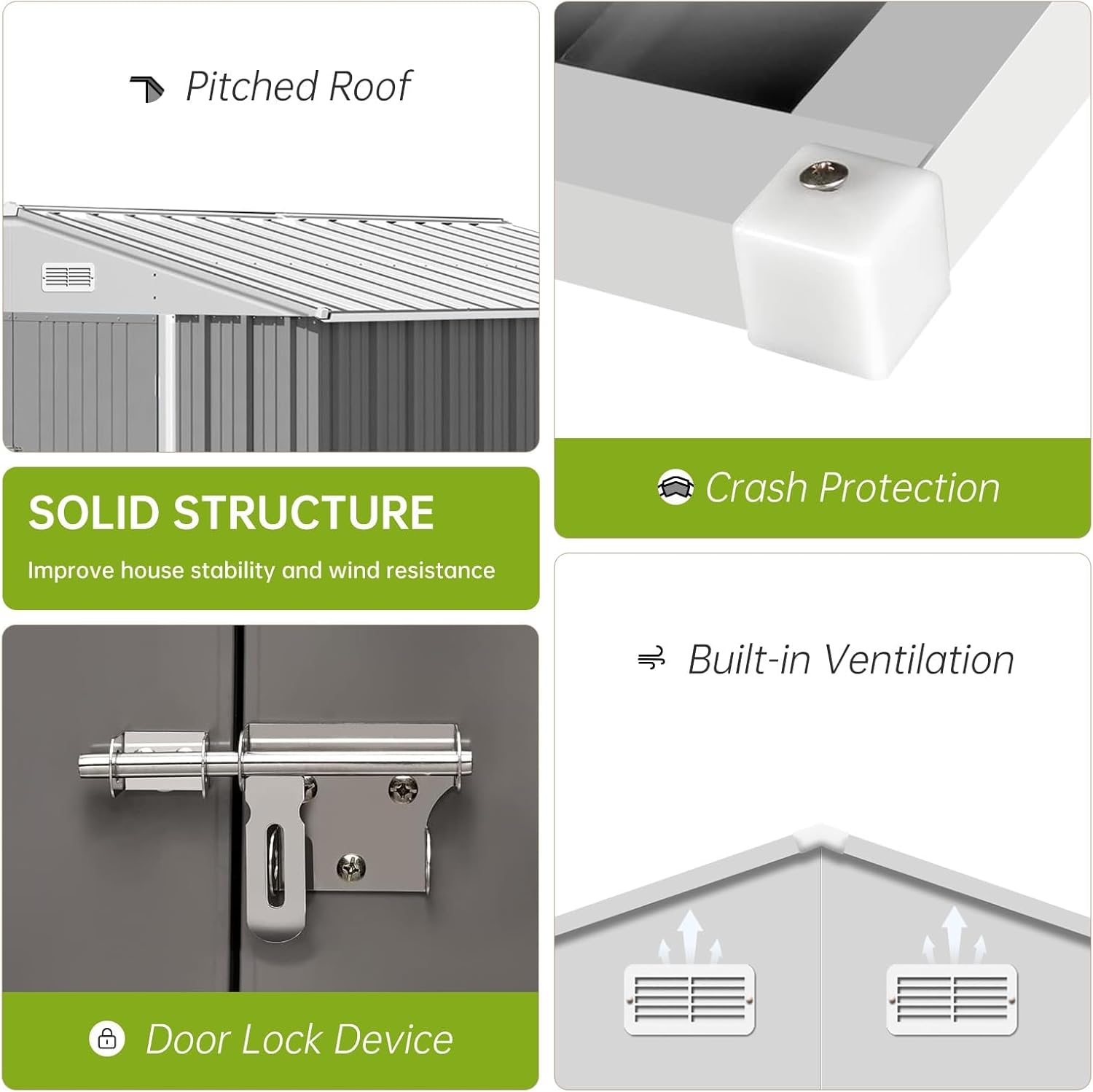 - Secure & Safe: Our metal garden shed features lockable double doors to keep your tools, lawn equipment, and valuables protected. Designed with user safety in mind, the heavy-duty storage shed includes rounded plastic corner guards on all edges and covered screw fittings, preventing accidental bumps and scrapes while you access your outdoor storage space.