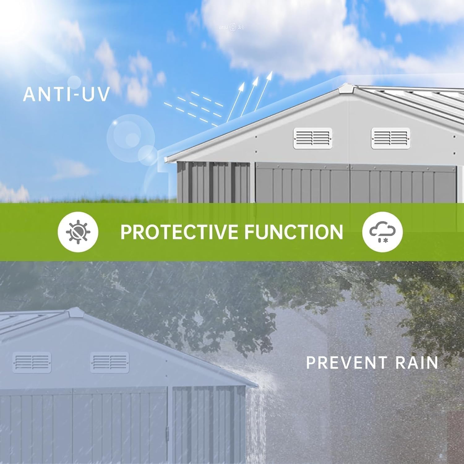 - Weatherproof & Damp-Resistant: The weatherproof garden shed features a sloping roof to prevent water pooling and galvanized steel panels that resist rust, rain, and UV damage. Proper ventilation reduces condensation, keeping stored items dry.