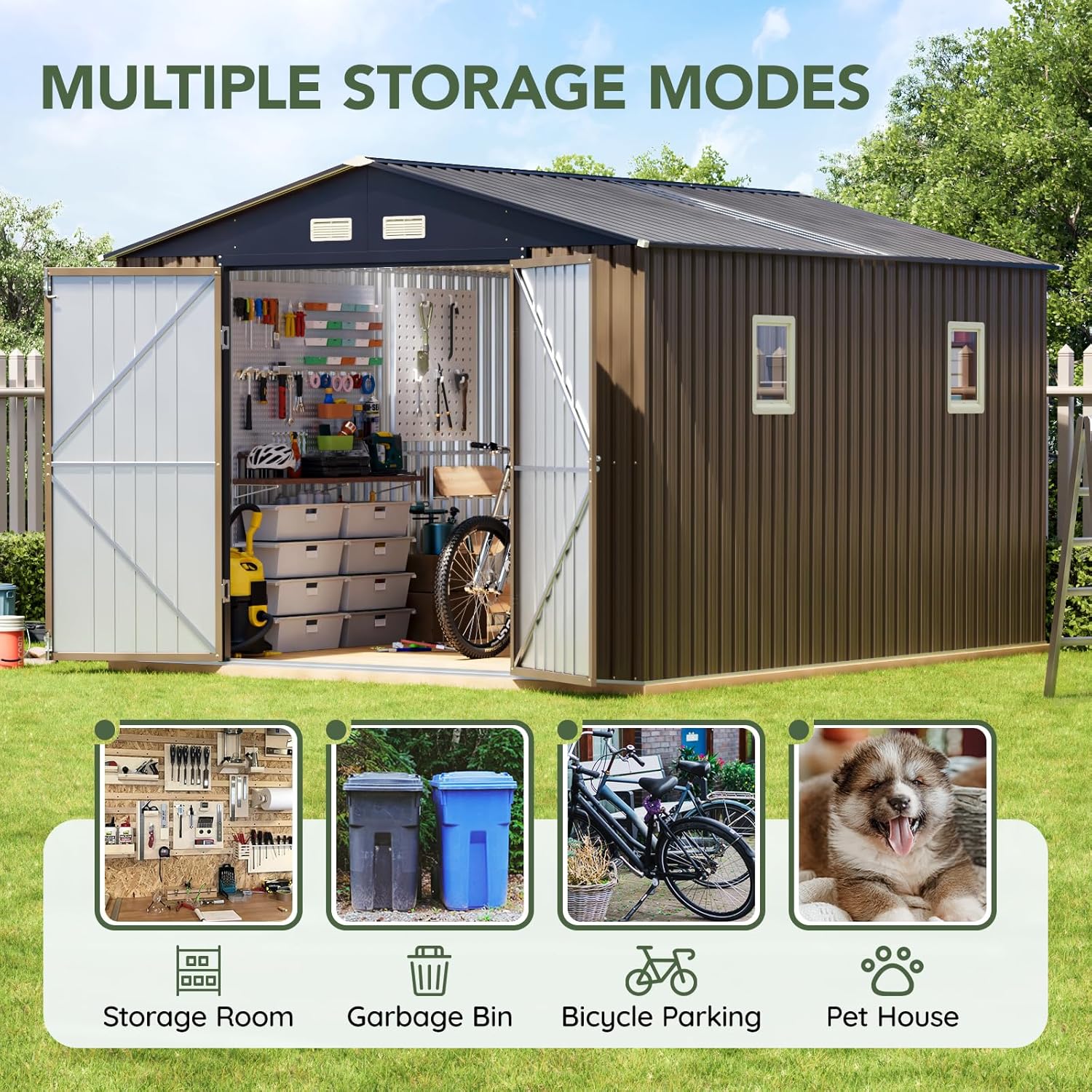 - Spacious 10x12 FT Storage Capacity – Provides ample space for storing bikes, lawn tools, garden supplies, and seasonal equipment. Perfect for backyard, patio, or garden use.