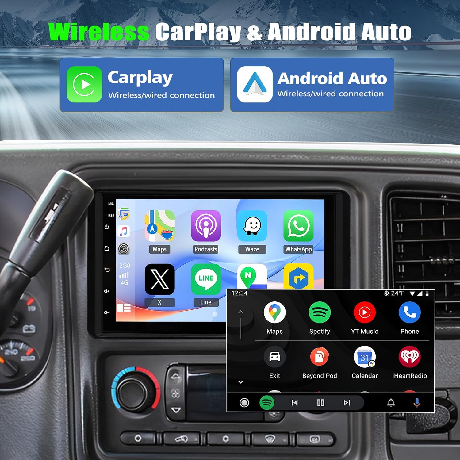 - ăSupport CarPlay & Android AutoăThis wireless carplay for 2003 silverado 1500 radio is compatible with CarPlay and Android Auto, you can connect your phone to CarPlay or Android auto by wired or wireless, it can easily access your phone contacts, emails, GPS navigation, music and so on, and integrate smart voice control via Siri and Google assistant, you can easily make calls, listen music, GPS navigation ect, keeps you stay focused, and brings you safer, more comfortable driving experience!