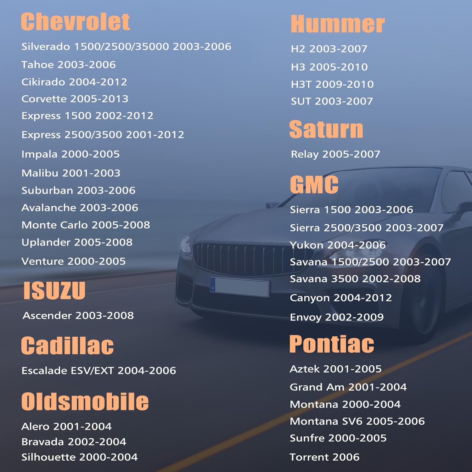- ăFits Model ăThe Car Radio fits for Chevrolet Chevy Silverado 1500 2500 3500 2003-2006; Tahoe 2003-2006; Colorado 2004-2012; Corvette 2005-2013; Express 1500 2500 3500 2002-2012; Impala 2000-2005; Malibu 2001-2003; Suburban 2003-2006; Avalanche 2003-2006; Sierra 1500 2500 3500 2003-2006; Yukon 2004-2006; Savana 1500 2500 3500 2003-2007; Canyon 2004-2012; Terraza 2005-2007; H2 2003-2007; H3 2005-2010; H3T 2009-2010; SUT 2003-2007; Monte Carlo 2000-2005; Uplander 2005-2008.