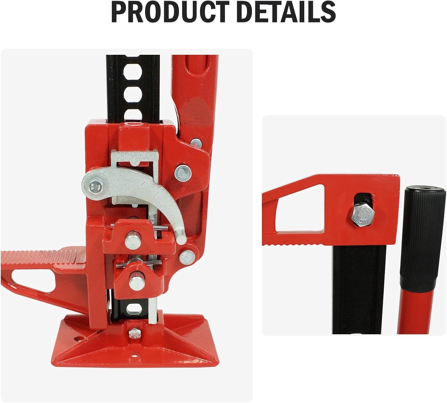 - ULTRA-STABLE & SAFE OFF ROAD JACK :Designed with a wide base for superior stability, this hi lift jack ensures secure operation on uneven terrain. The ratcheting mechanism allows precise height adjustments, making it ideal for offroad jack recovery and heavy-duty farm tasks.