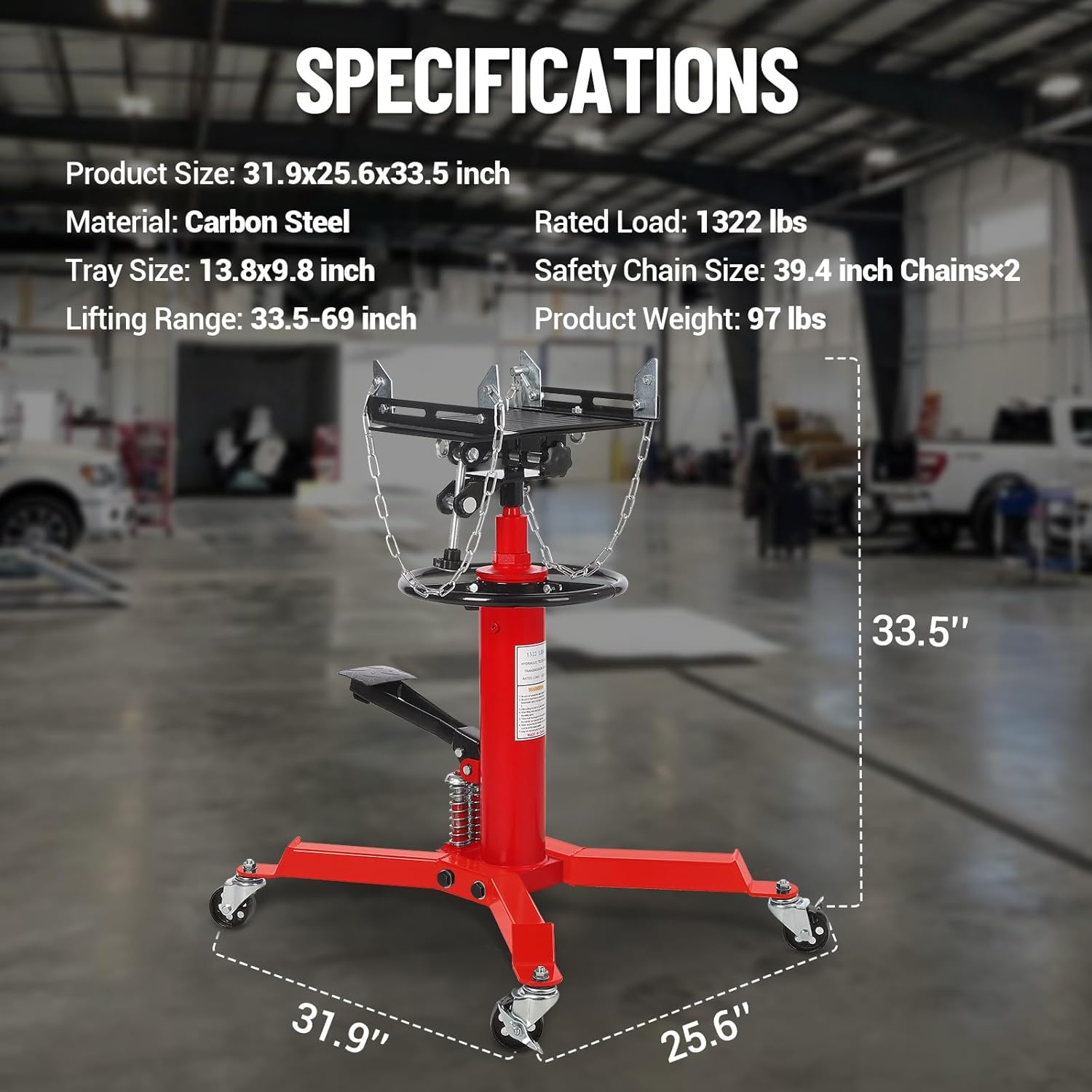 - Extended Lift Range: The hydraulic transmission jack's telescoping height adjusts from 34" to 69" with dual plungers, ideal for low-profile sedans and lifted vehicles. Foot pedal controls ensure precise one-handed operation.