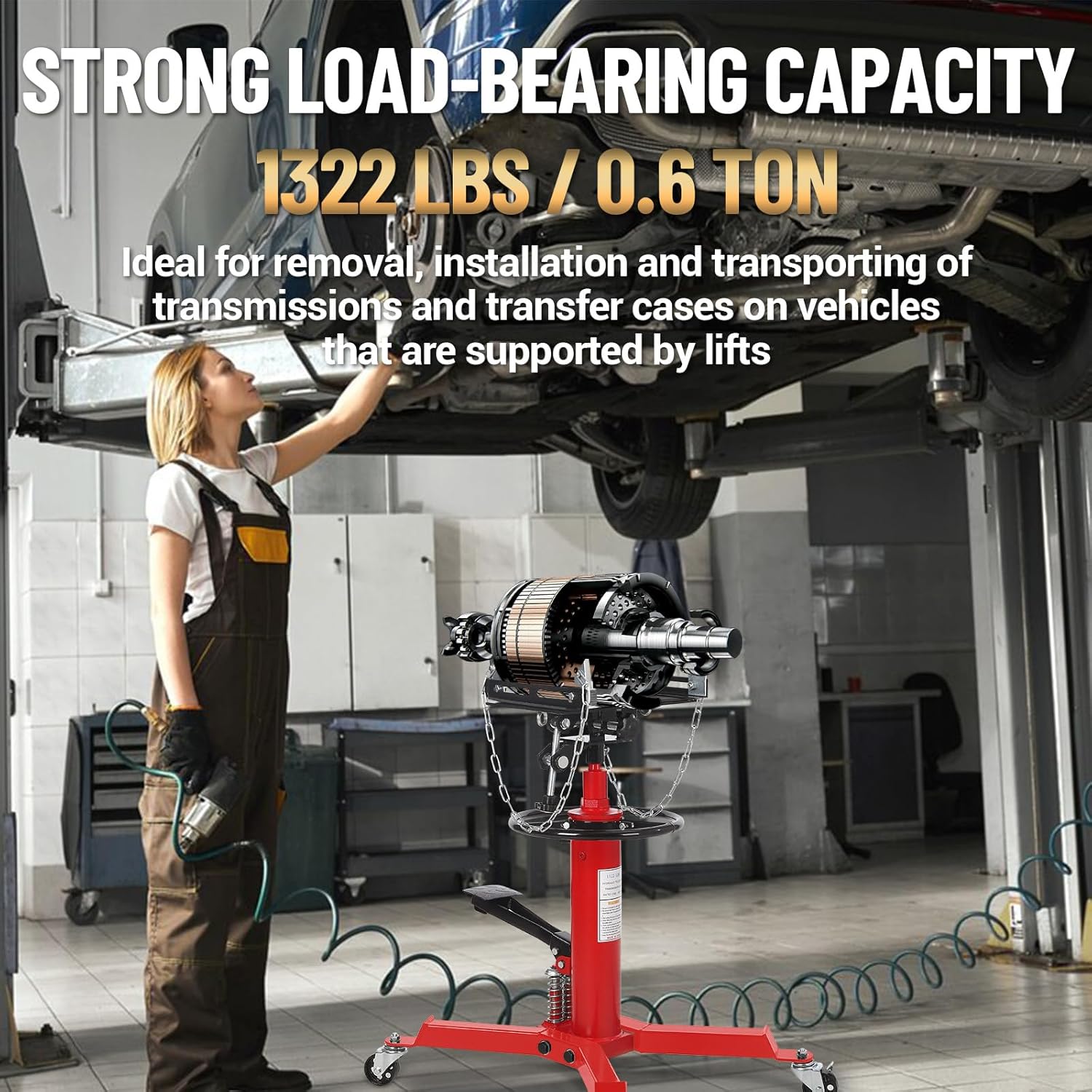 - Industrial-Grade Load Capacity: The hydraulic transmission jack's 2-stage hydraulic ram safely lifts up to 1322 lbs. Reinforced steel frame prevents bending during transmission removal on trucks/SUVs.