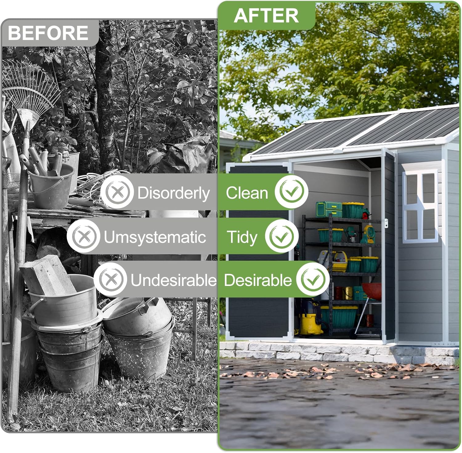 - 【Premium and Durable Material】The 14mm tough double-wall resin construction, 0.6 mm galvanized steel frame and impact-resistant floor are designed for long-term durability. The double-wall panels are waterproof and moisture-proof, allowing worry-free use in all weather conditions. It is weather-resistant, waterproof, and UV-resistant-no peeling, rotting, or rusting. The screws are embedded to ensure aesthetics and safety