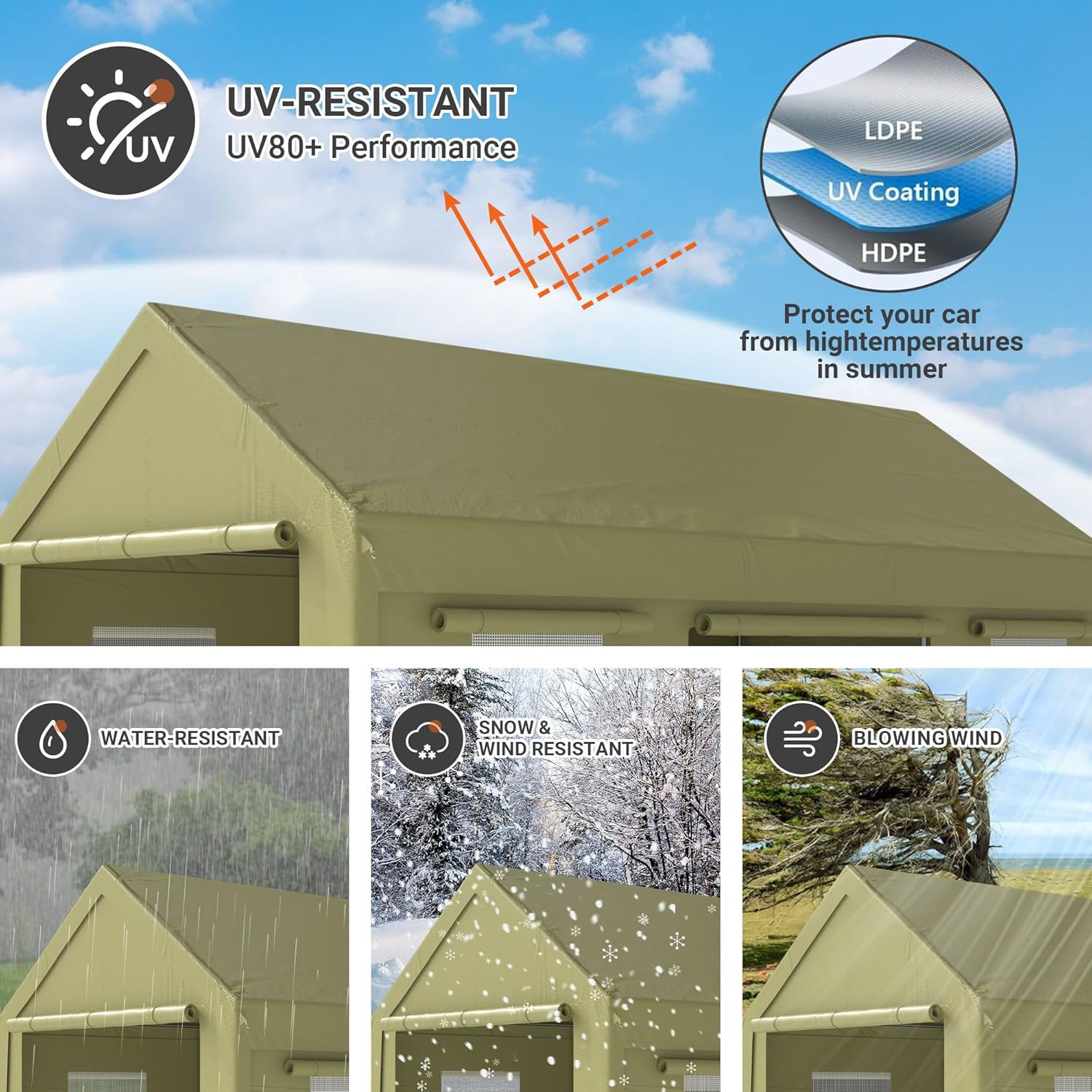 - 【Strong and Durable】Three-layer UV-resistant polyethylene canopy blocks 99% of the sun's rays, along with waterproof seams and rust-resistant frames for long-lasting protection against rain, hail, and fading. Supported by eight heavy-duty galvanized metal poles, ground stakes and cable connections provide triple security for added stability.