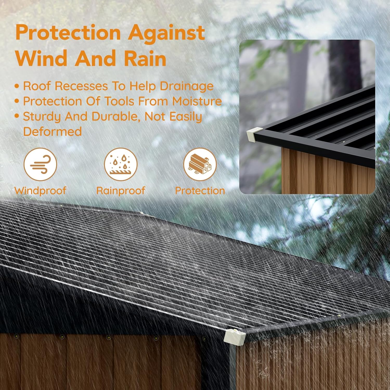 - [Security and Durability] The whole storage shed is a steel frame structure, the metal garden storage shed adopts electro-galvanized steel process and paint treatment, which is suitable for various climates, without worrying about the metal rusting, the all-metal storage shed will not be deformed by the sun, and has excellent moisture-proof ,UV resistant performance.