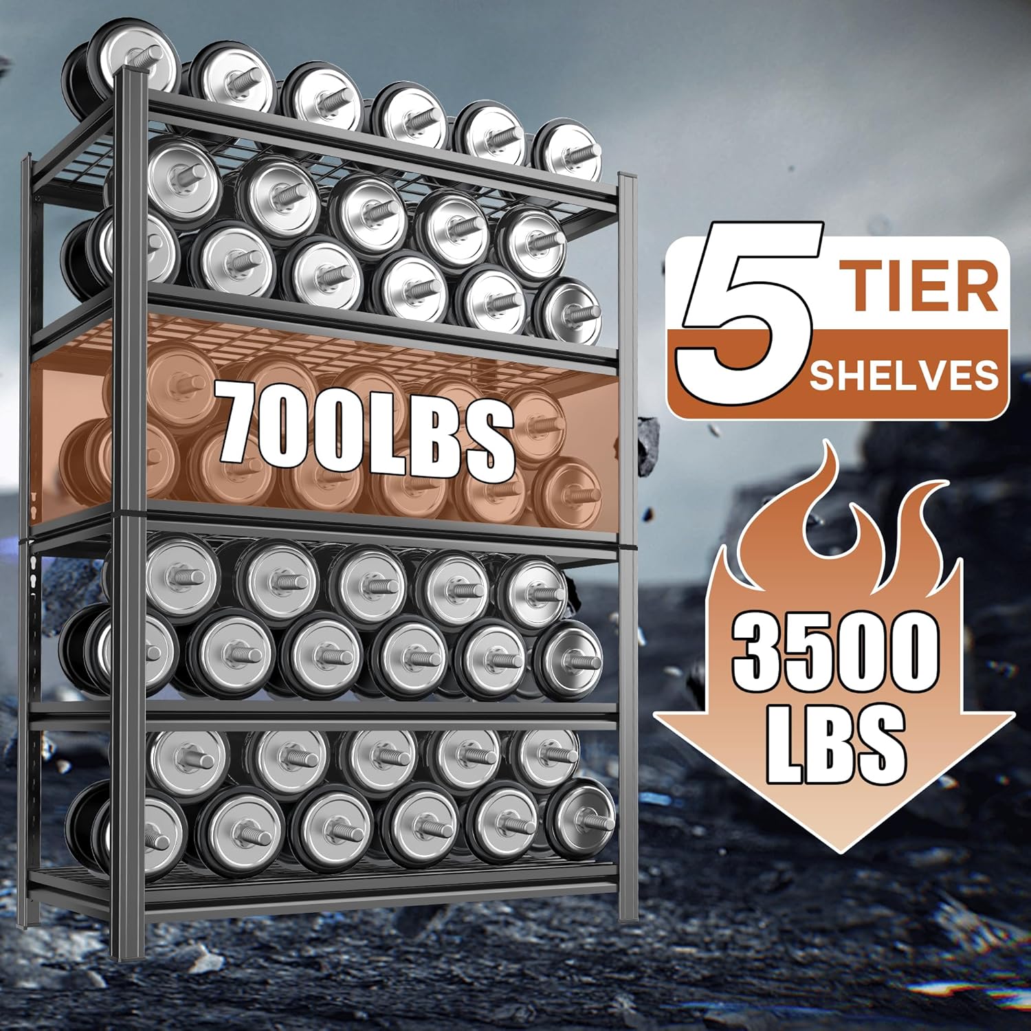 - 💪 COMMERCIAL-GRADE STRENGTH, 3500 LBS BEAST MODE – Don't settle for flimsy shelves. Our garage shelving is forged from high-quality, thickened cold-rolled steel and features an exclusive double-layered column design for unmatched stability. It effortlessly supports a massive 3500 LBS total capacity (700 LBS per shelf). From heavy power tools and packed totes to engine parts, store your heaviest items with absolute peace of mind. Conquer your clutter with confidence!