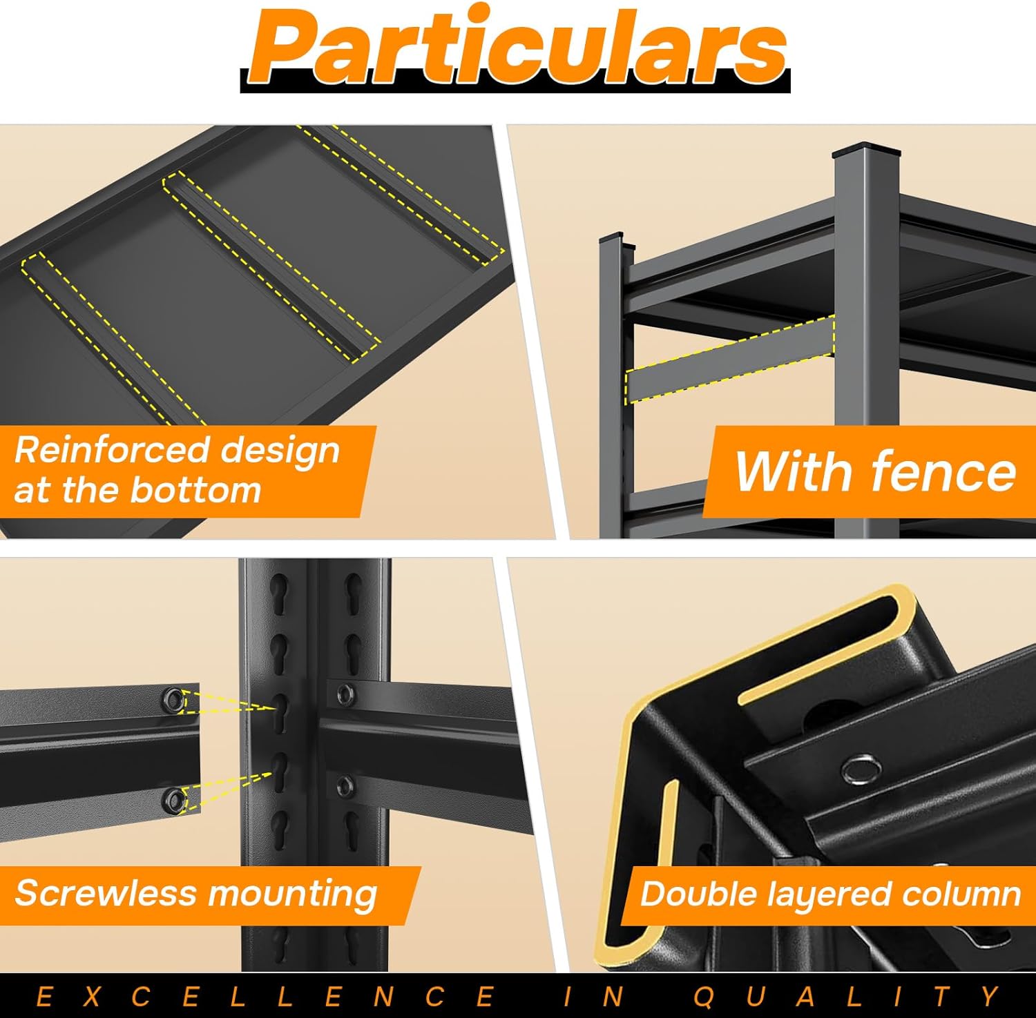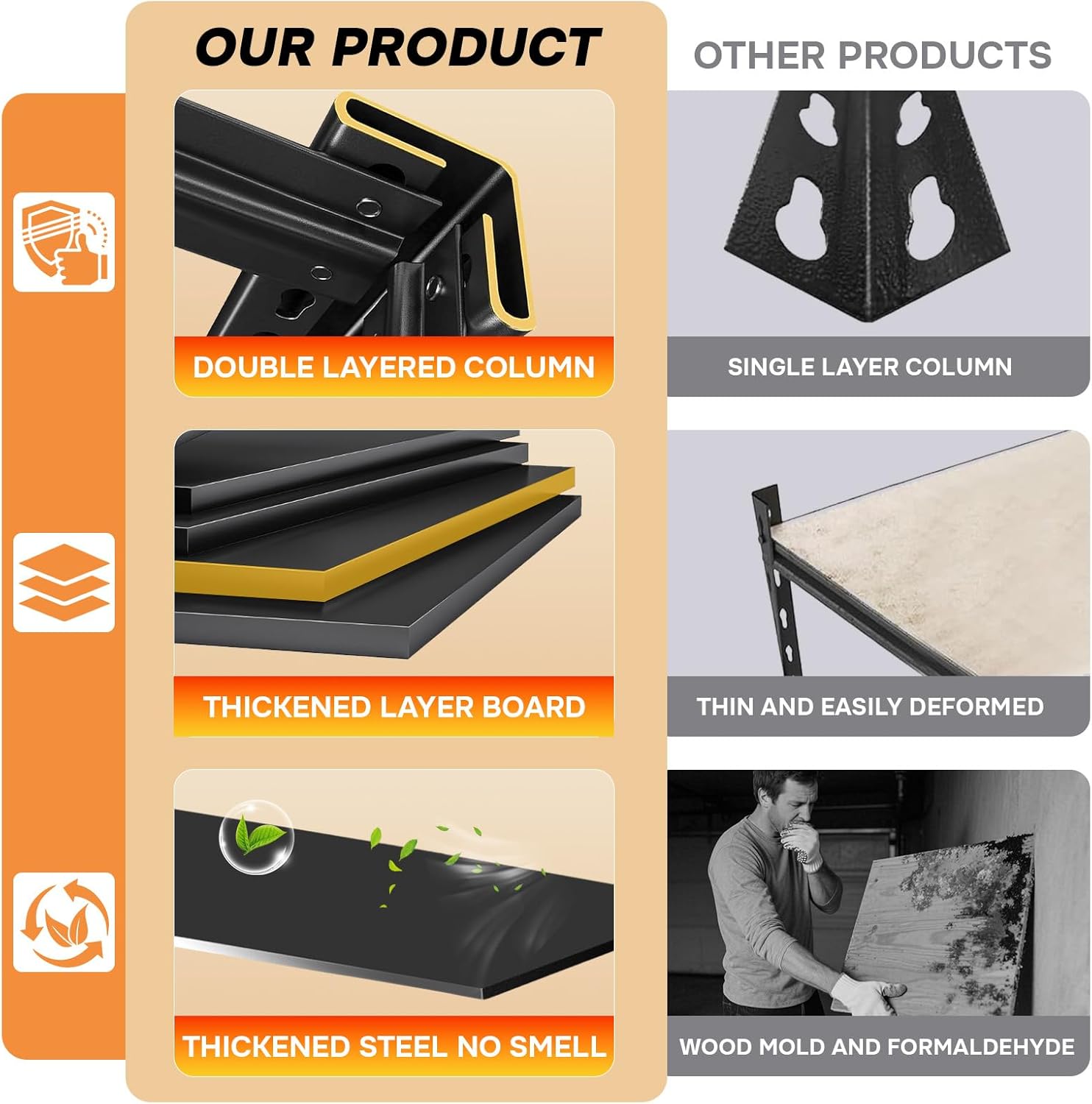 - Enhanced Stability with Double-Layer Uprights,Compared to basic single-layer metal shelving, our upgraded double-layer uprights for this garage shelving boost load-bearing capacity and help reduce warping. Ideal for heavy-duty use, this metal shelving design supports long-term durability with minimized wobbling or sagging, outperforming flimsier storage shelves in daily use