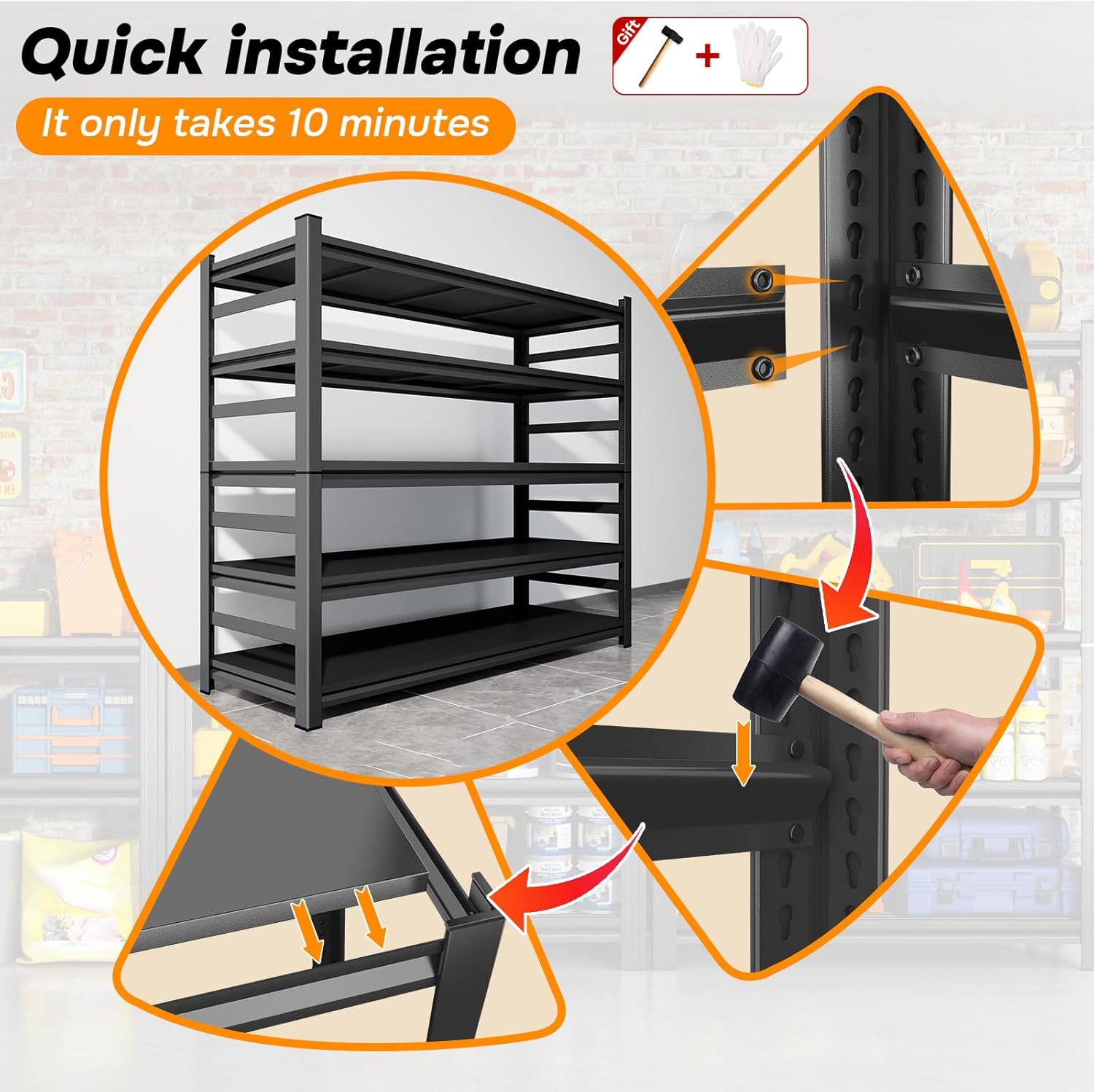 - Tool-Free Assembly in 10 Minutes,Designed for simple setup, our storage rack uses interlocking mechanisms—no bolts, nuts, or tools required. Even beginners can assemble this garage shelving unit in just 10 minutes