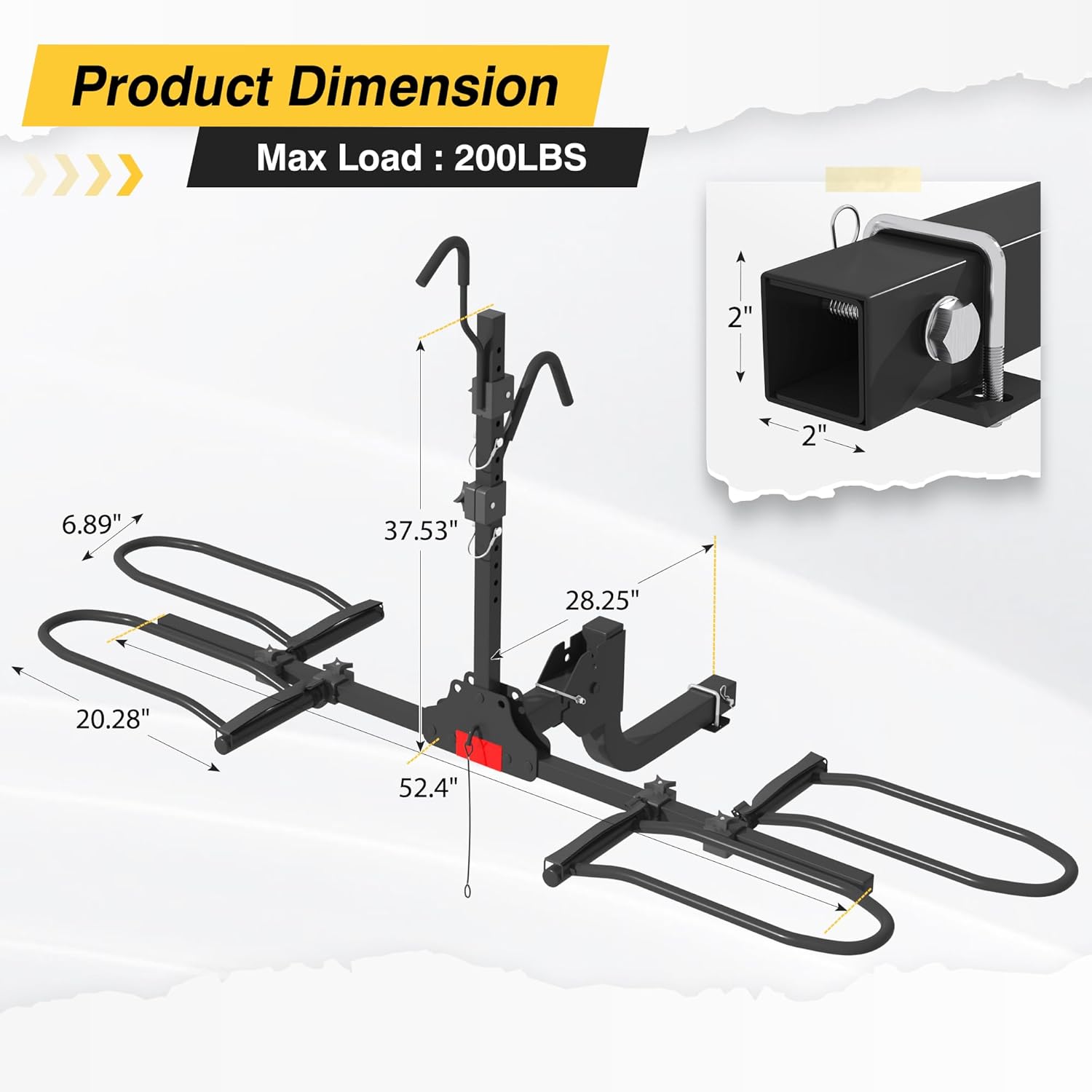 - ă200 lb Total CapacityăThis bicycle car rack is made of refined high-strength alloy steel and can carry 2 bicycles each weighing 100 lbs, with a total load capacity of 200 lbs. Suitable for tire widths up to 5 inch, designed specifically for loading various bicycles such as road bikes, mountain bikes, fat tires, and electric bikes.