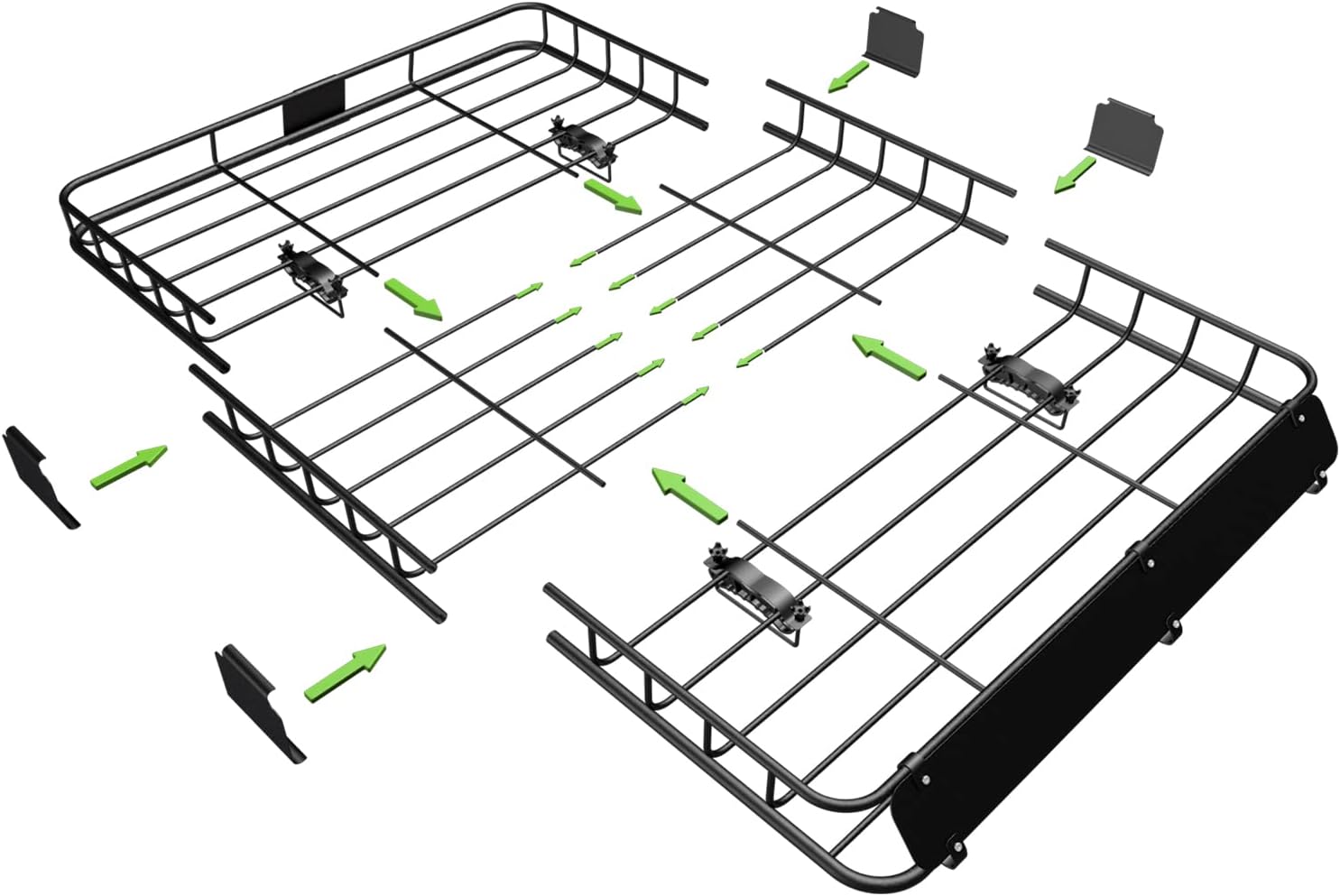 - Overall Dimensions: The roof rack measures 54" (L) x 34" (W) x 5" (H) when fully assembled and can be adjusted to 35 x 34 x 6" or 54 x 34 x 6" to fit different vehicles, such as SUVs, MPVs, and pick-up trucks.