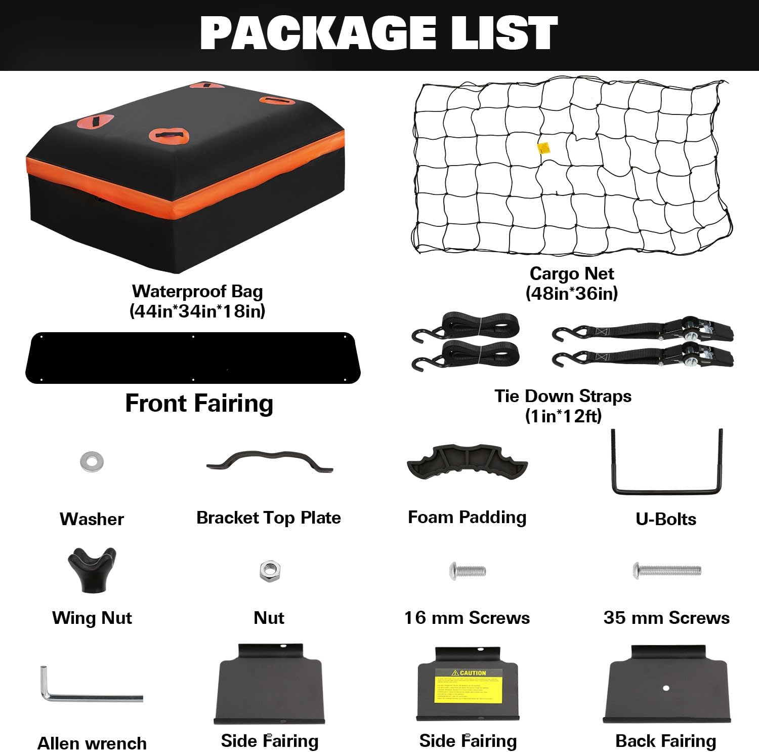 - Included Accessories: Comes with a waterproof bag, a cargo net with attachment hooks, and a pair of ratchet tie-down straps for secure cargo transport.